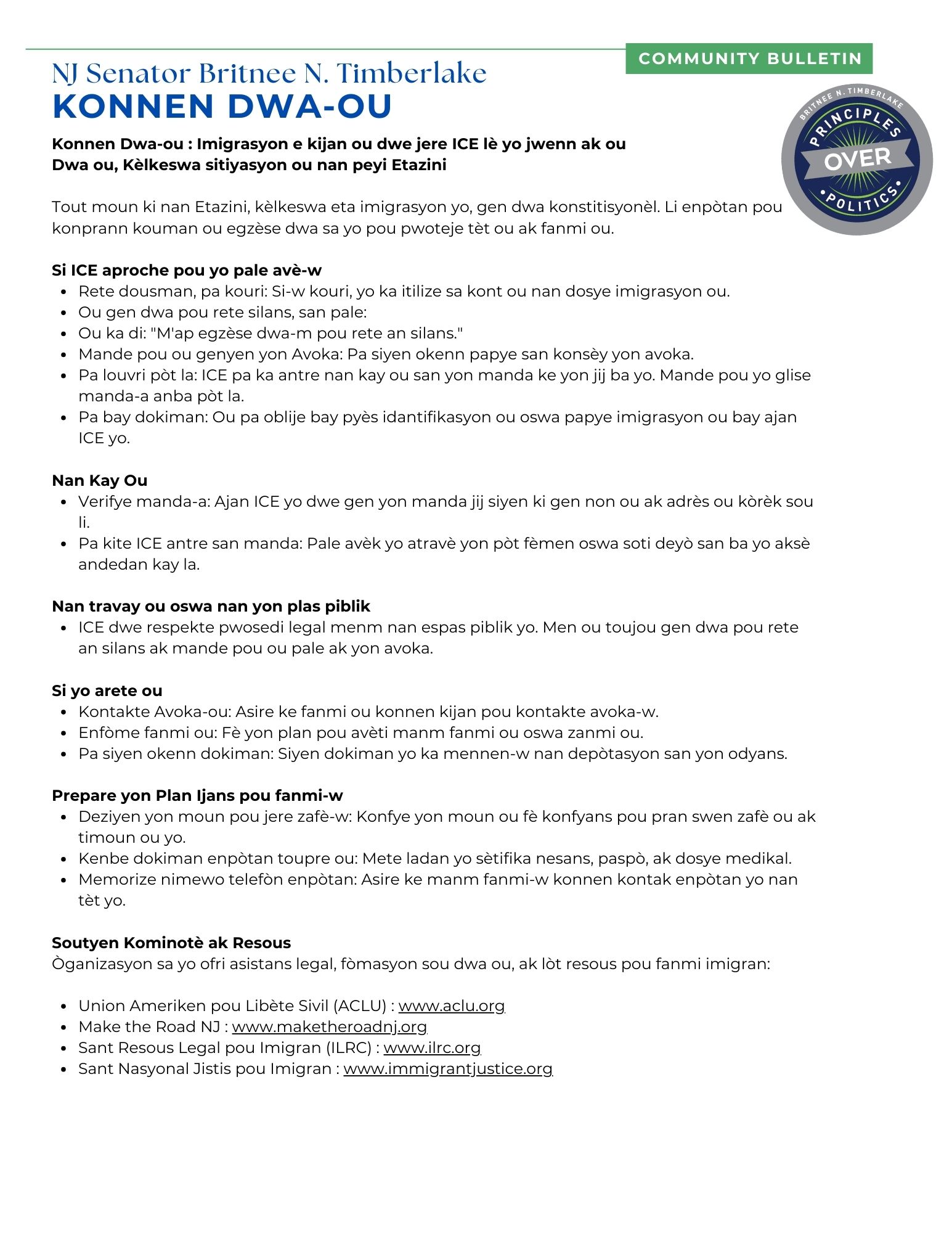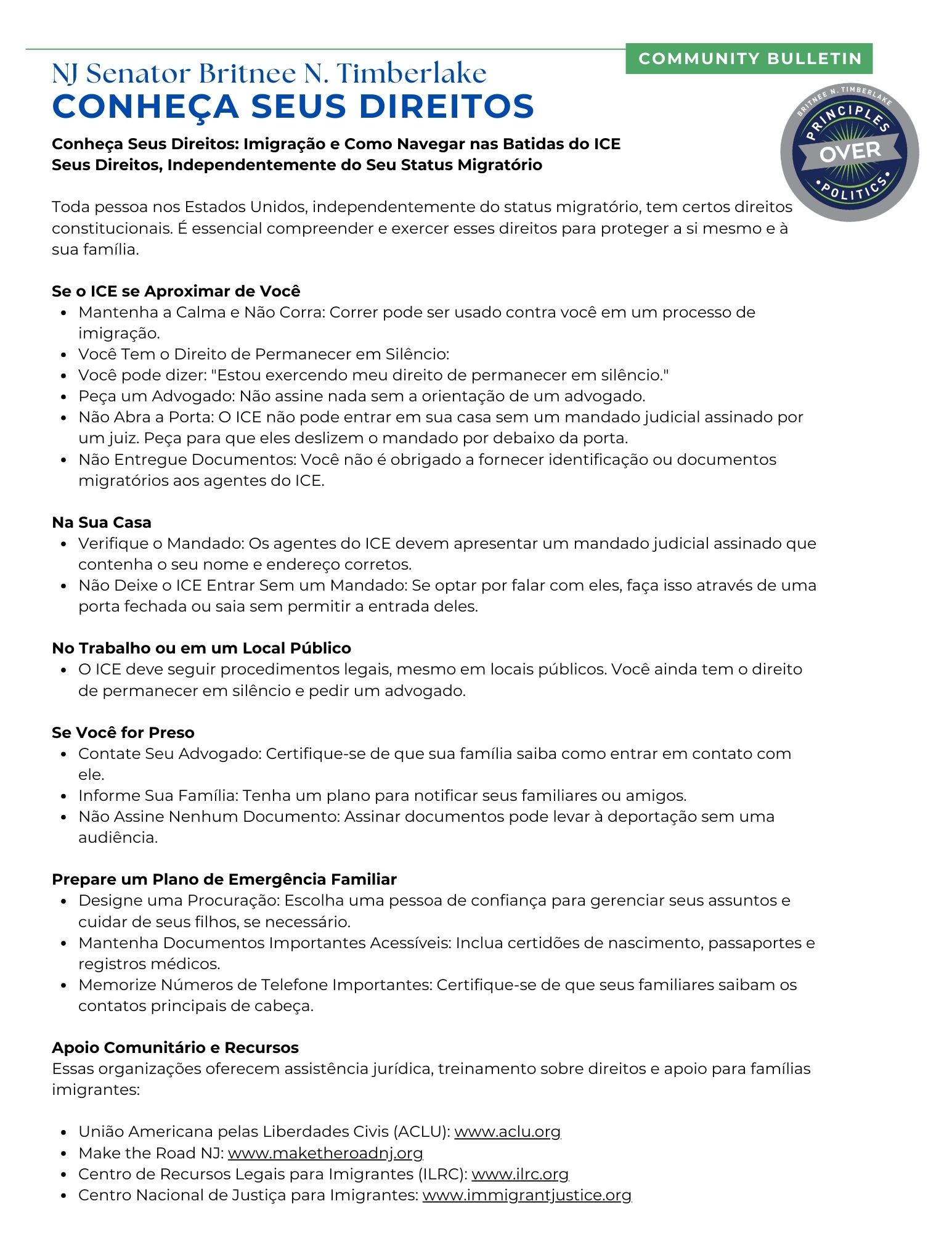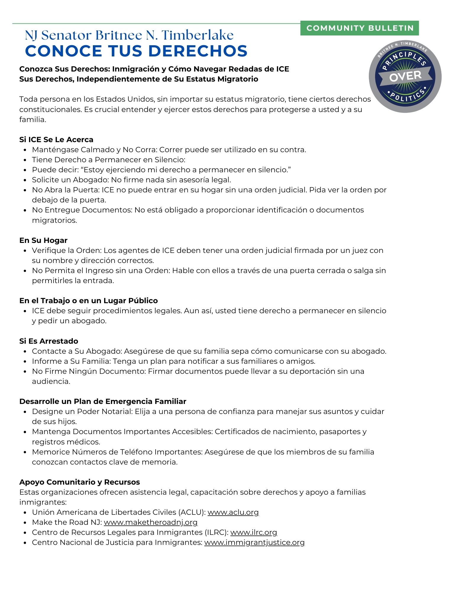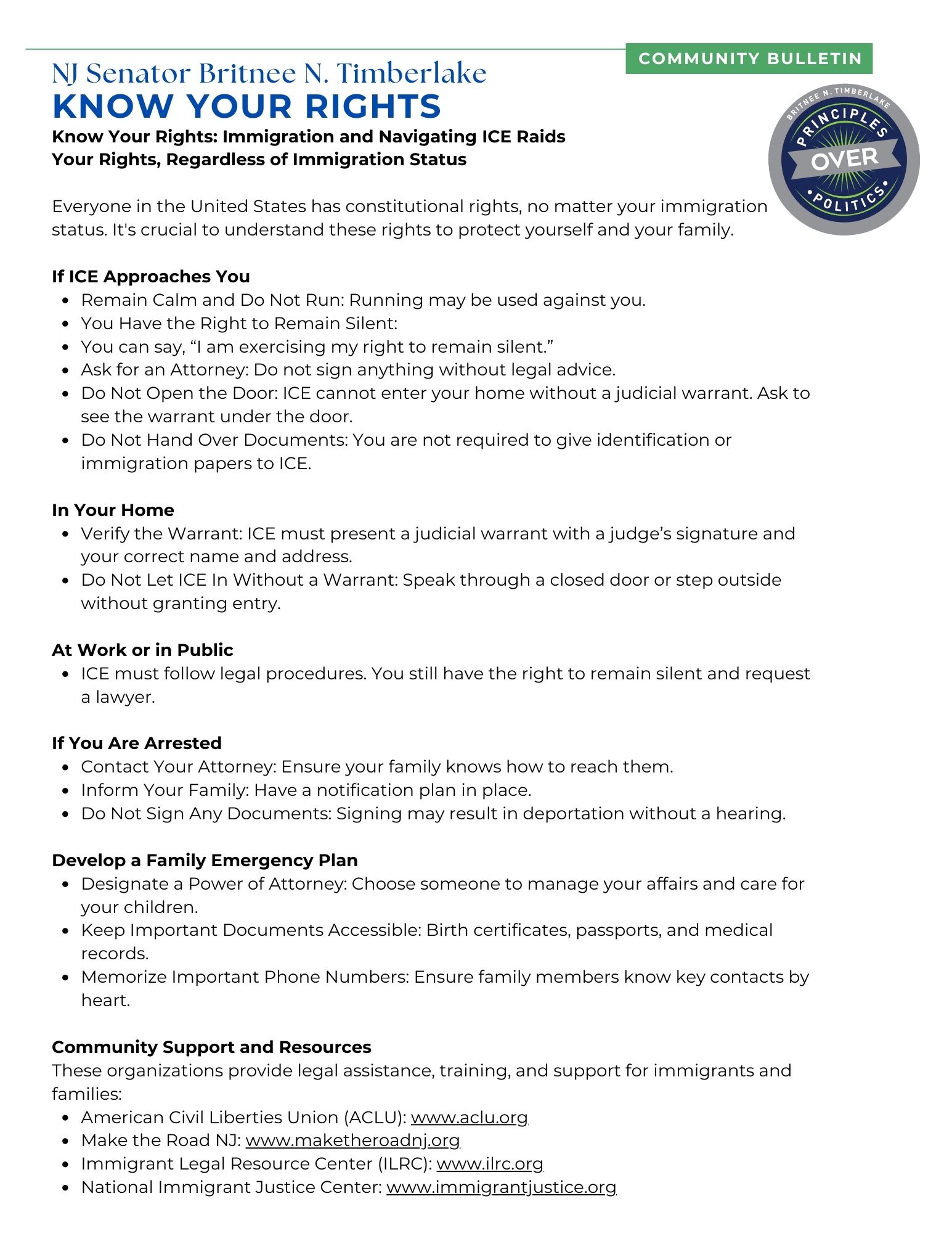 As a nation of immigrants, we must confront this reality and stand together. I, Senator Britnee N. Timberlake, am committed to advocating for humane immigration policies and ensuring our communities have access to the tools and knowledge needed to protect themselves. Knowing your rights is critical now more than ever.